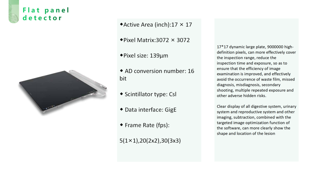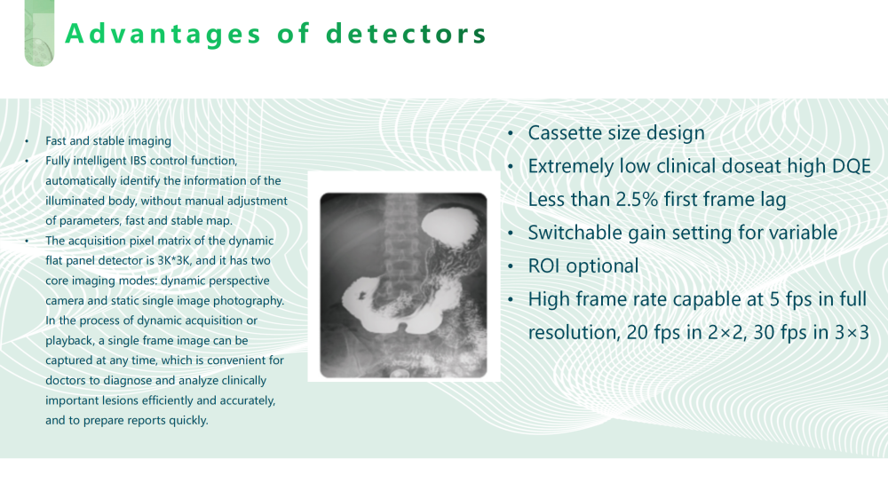 Can output continuous dynamic images, used in conventional gastrointestinal X-ray fluoroscopy and photography, to provide radiological guidance for patient diagnosis and display.